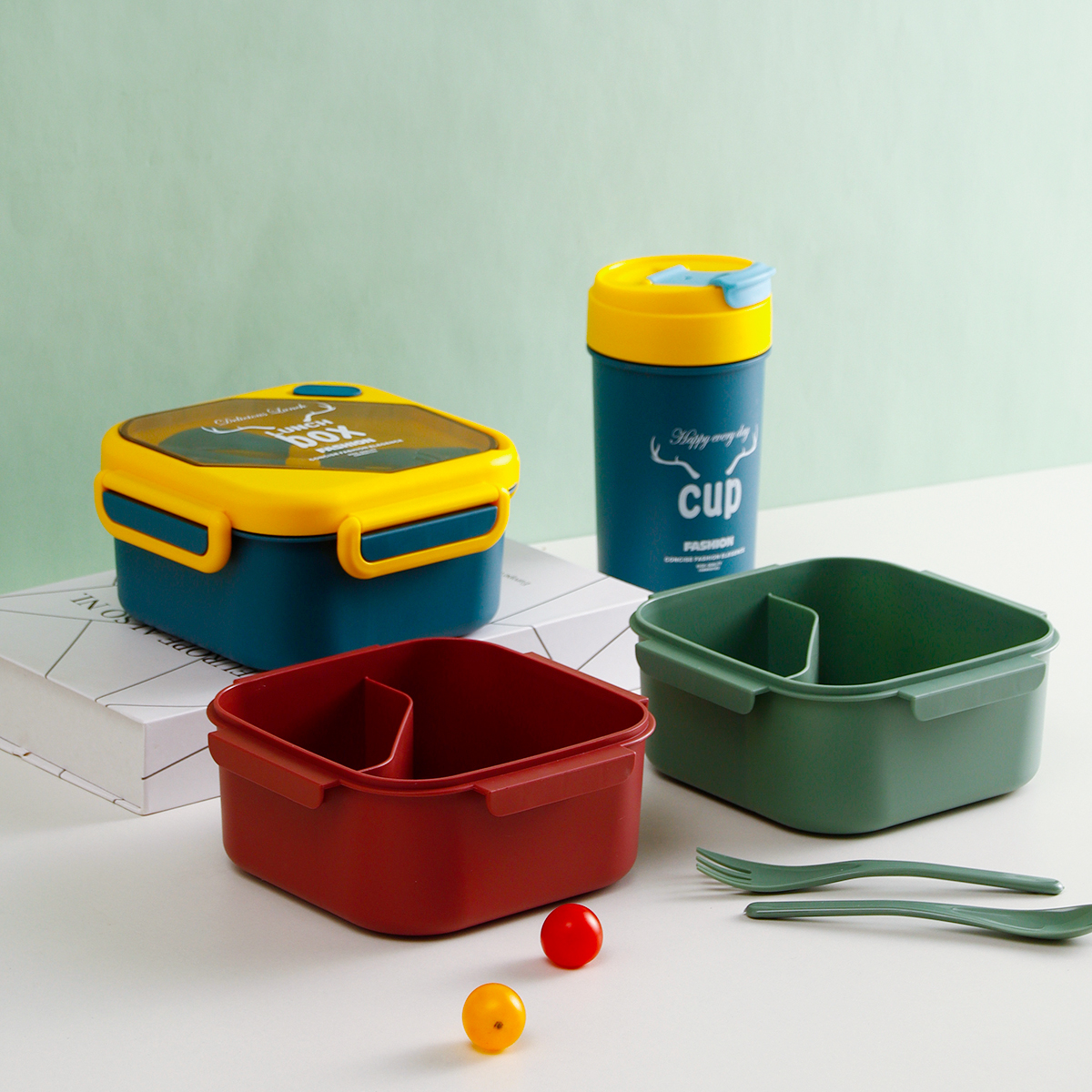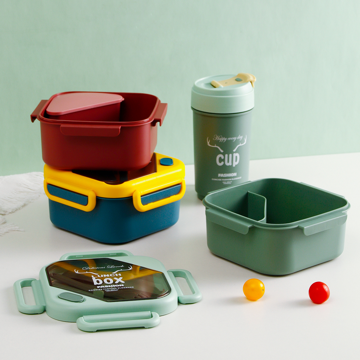 品悅正方單層分格/單層(含格子)密封飯盒+圓形/八角隨行杯