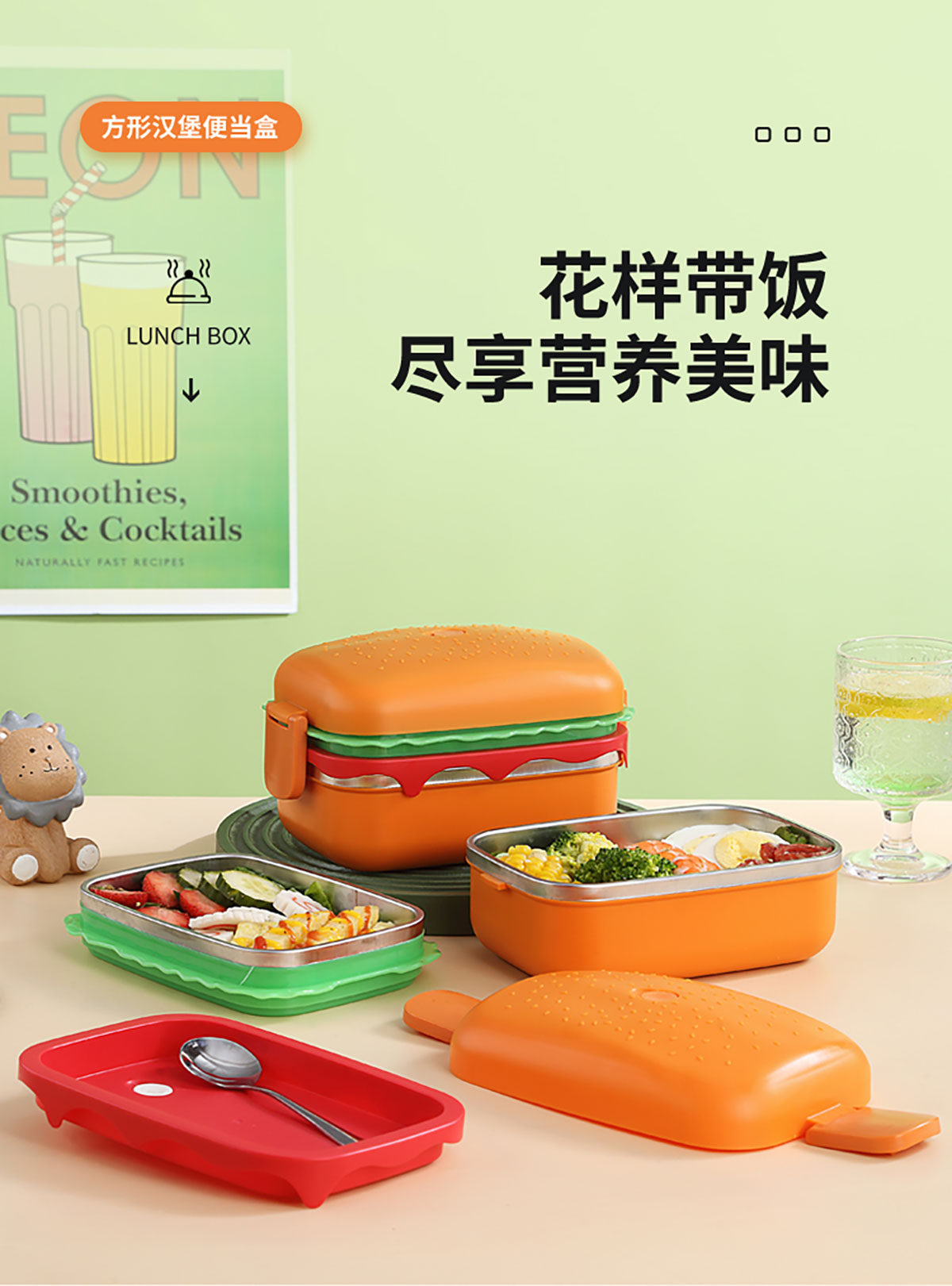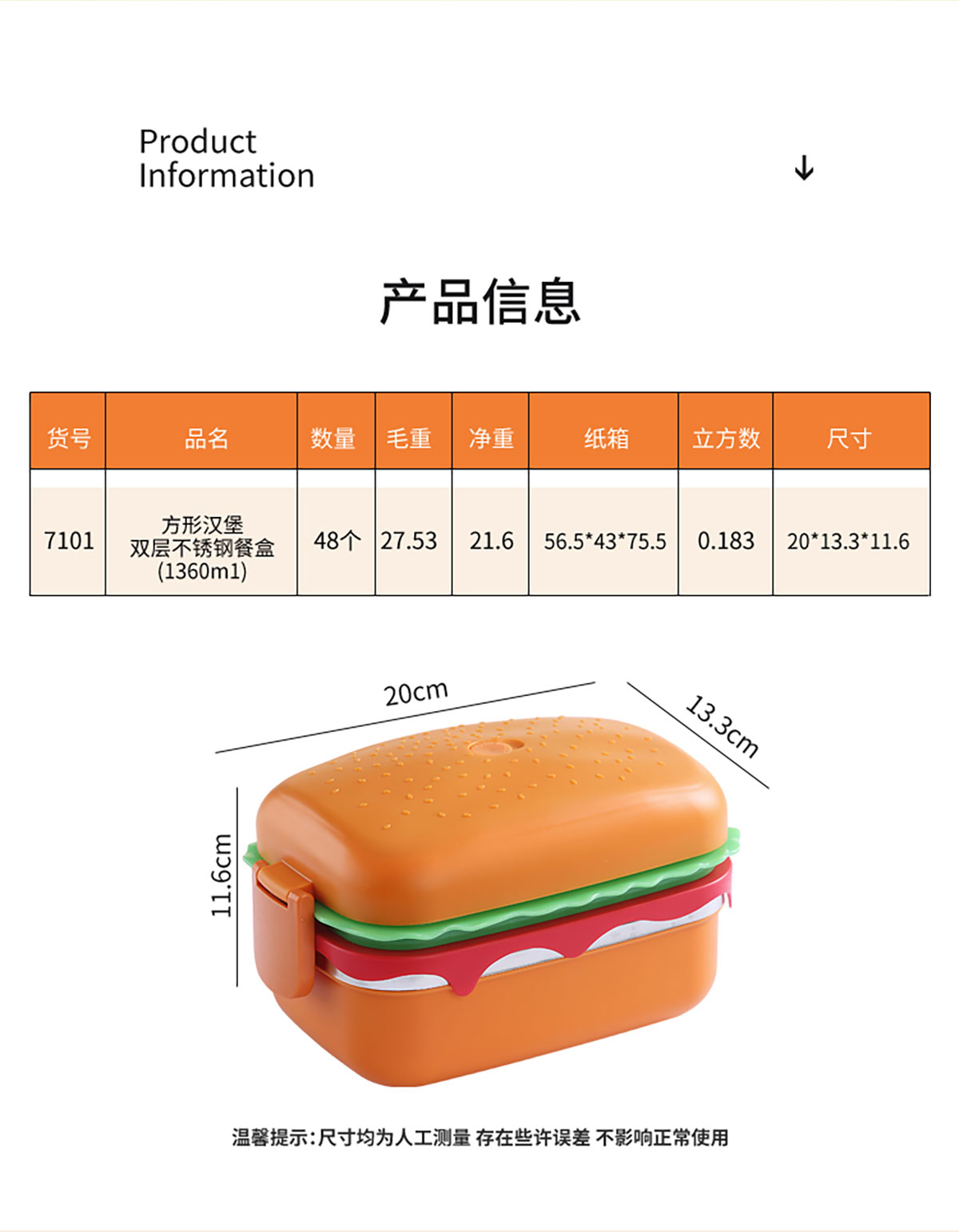 方形漢堡雙層不銹鋼餐盒(1360ml)