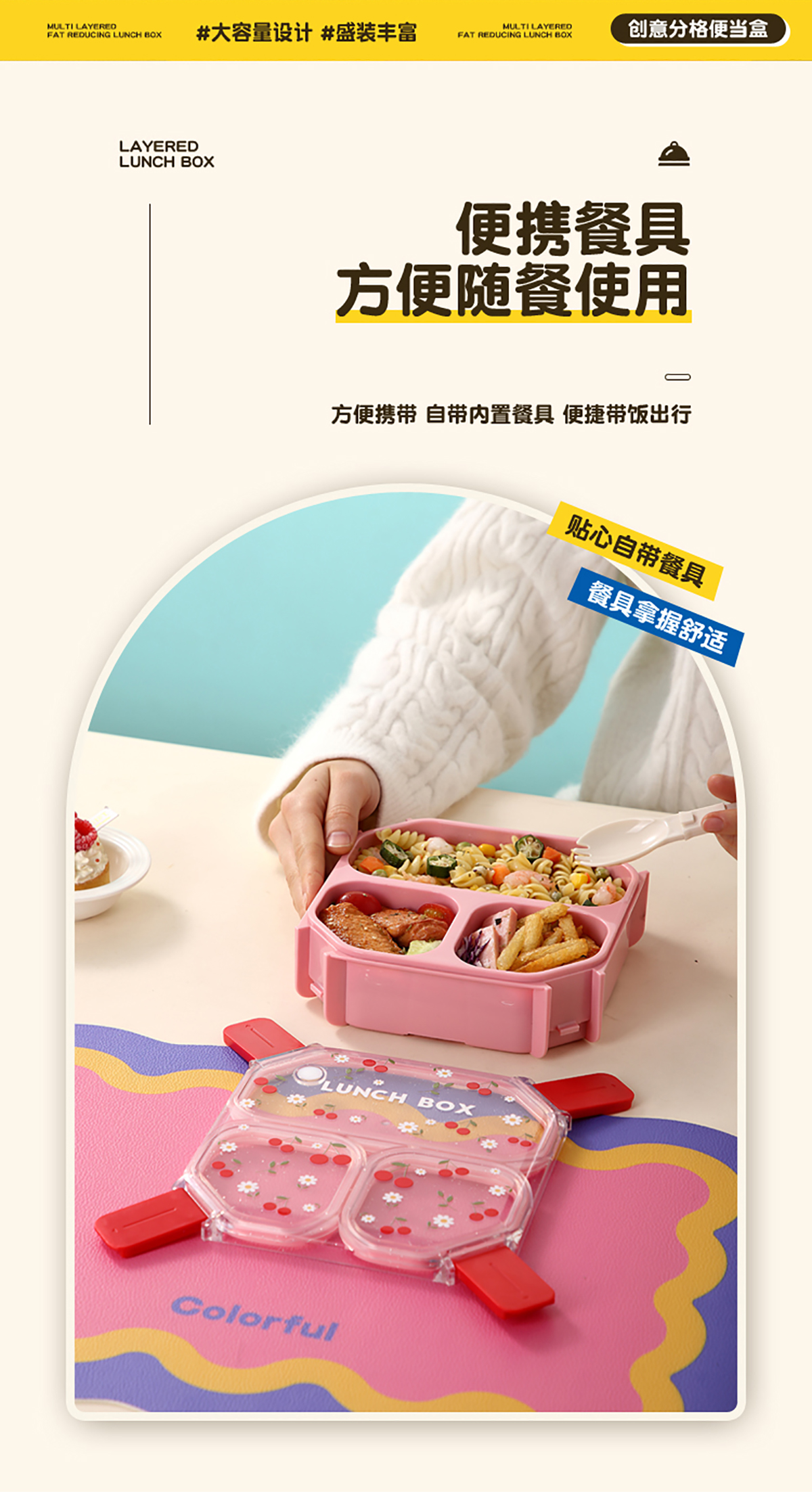 UV手提獨立密封方形塑料二格1.05L/三格980ml餐盒 (配PP折疊叉勺)
